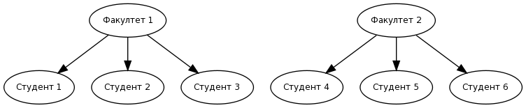 На сличан начин као и код организације факултета и предмета, уређена је и организација факултета и студената. Хијерархијска организација факултета и студената дефинише да се на једном факултету може наћи више студената, али да се један студент не може наћи на више, већ само на једном факултету (слика 4). Ово не значи да се на два различита факултета не могу наћи студенти са истим бројем индекса, именом и презименом, већ да су у питању потпуно различити студенти чији су резултати потпуно одвојени.