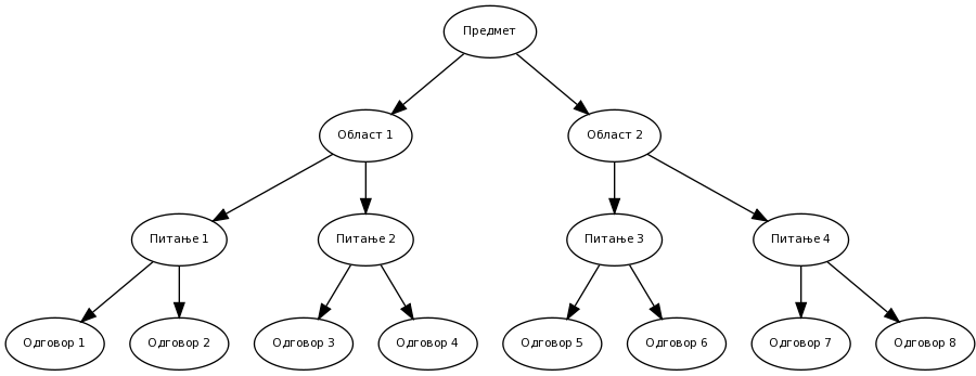 Основни носилац садржаја (питања) у систему јесте предмет. Предмет се дели на области а у области се уносе питања и одговори (слика 6). Правила која важе у овој хијерархији су: