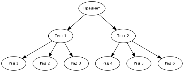 Организација тестова и студентских радова у систему подразумева да се тестови креирају у оквиру предмета а студентски радови се односе на те тестове (слика 7). Тестови могу припадати само једном предмету и могу користити само питања из тог предмета. Такође, један студентски рад се односи само на један тест. Студент може имати више радова преко система из више предмета или из једног предмета (уколико је у тесту дозвољено понављање).